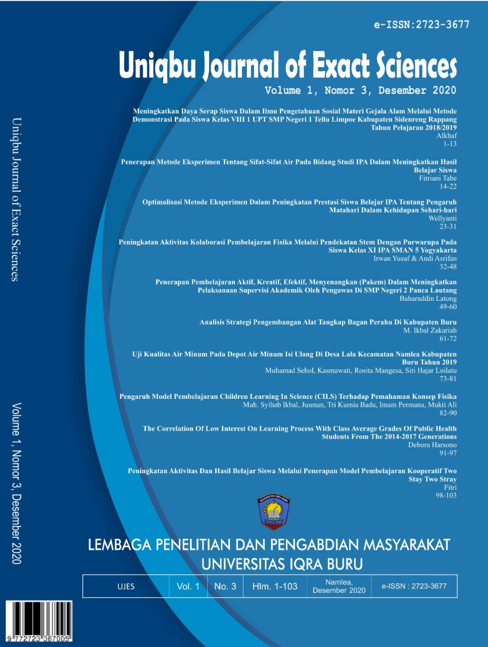 Malmia, W., Latbual, J., Hentihu, V. R., & Loilatu, S. H. (2020). EFEKTIFITAS PEMBELAJARAN CONTEXTUAL TEACHING AND LEARNING (CTL) TERHADAP HASIL BELAJAR MATEMATIKA SISWA : (The Effectiveness of Contextual Teaching and Learning (CTL) on Student Mathematics Learning Achievements). Uniqbu Journal of Exact Sciences, 1(2), 31-39.